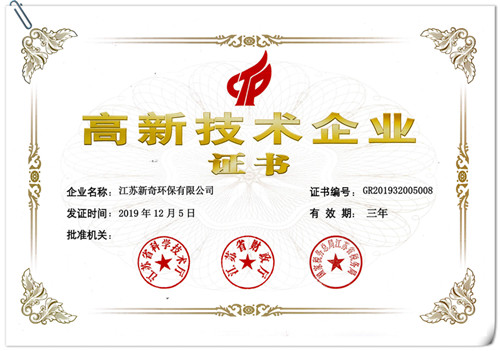 近日,江蘇新奇環(huán)保有限公司收到由江蘇省科學技術廳,江蘇省財政廳、國家稅務總局江蘇省稅務局聯(lián)合頒發(fā)的“高新技術企業(yè)”認定證書,新奇環(huán)保憑借扎實的硬件基礎和雄厚的研發(fā)實力,再一次邁入高新技術企業(yè)行列,證書編號:GR201932005008,證書有效期三年。