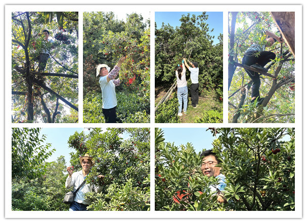 團(tuán)建活動(dòng)第二站是大家翹首以盼的“梅”味時(shí)刻,烈日當(dāng)空,滿山遍野的楊梅樹,萬千紅果掛滿樹梢,綠葉凝翠,絳紅欲滴,一顆顆掛滿枝頭,在陽光下的照耀下顯得格外誘人。有些楊梅樹較高,大家相互協(xié)作,分工明確,矯健的男生爬上樹干摘,個(gè)子高的人負(fù)責(zé)拉低枝頭,女同胞主要采摘收集,林間時(shí)不時(shí)傳來大家的歡聲笑語。