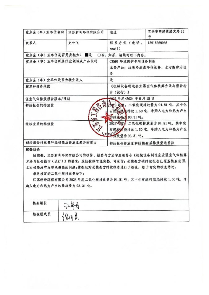 江蘇新奇環(huán)保有限公司產(chǎn)品碳足跡核查聲明